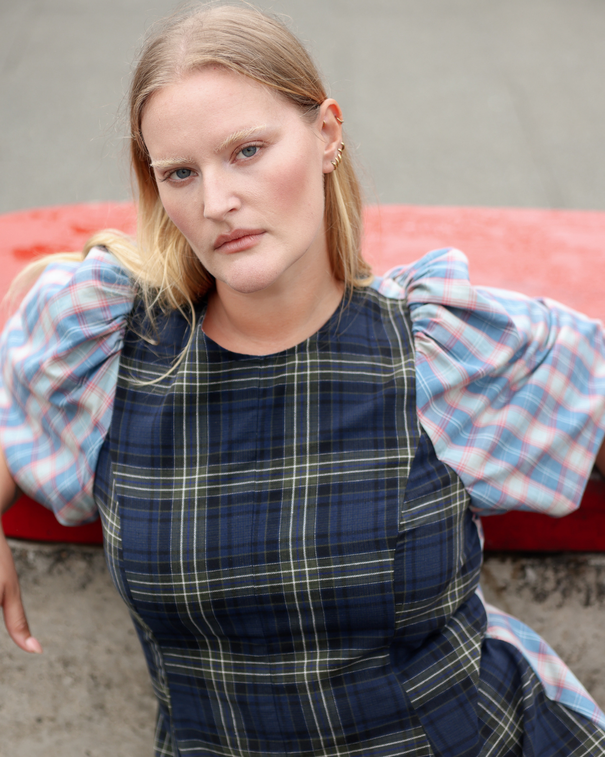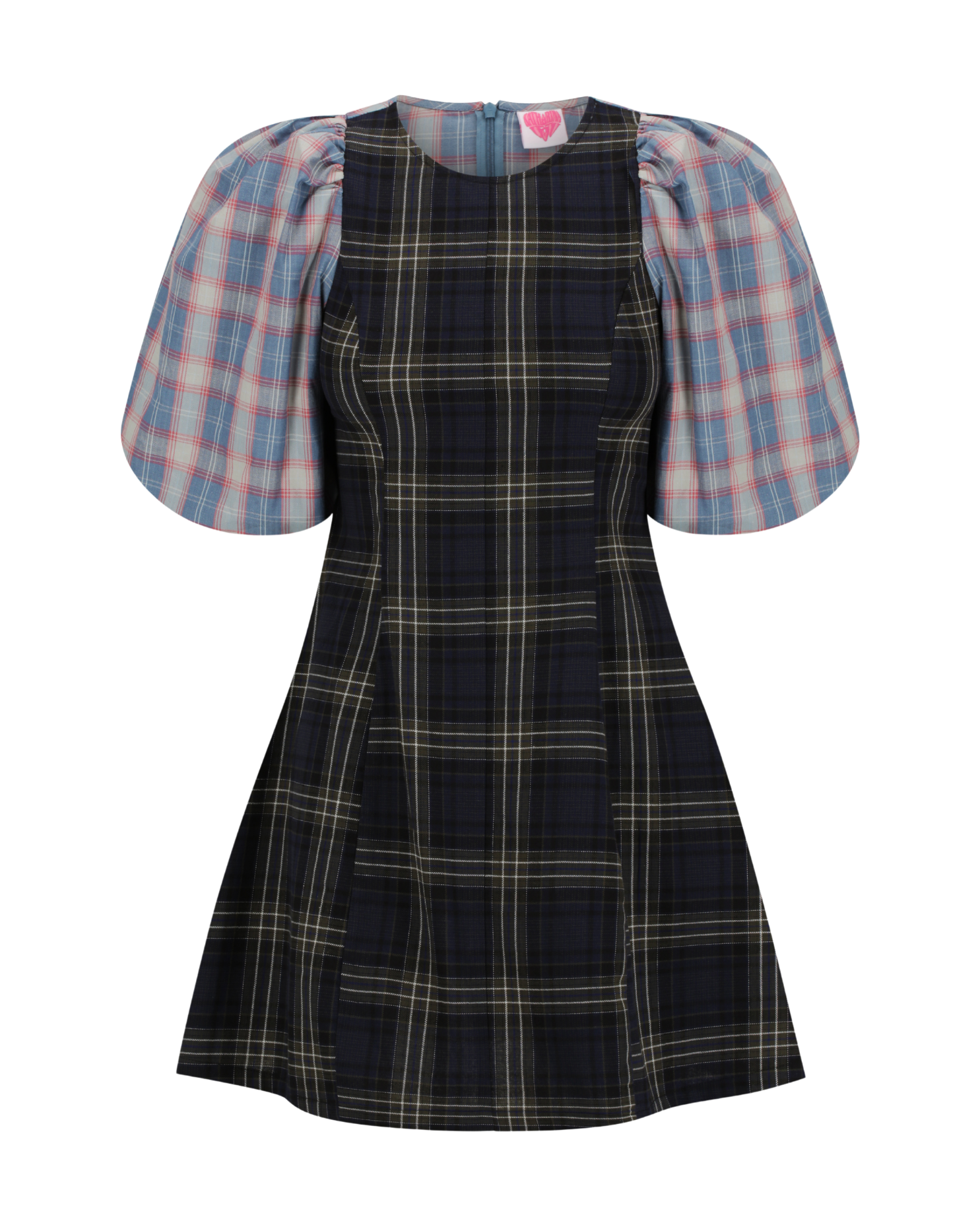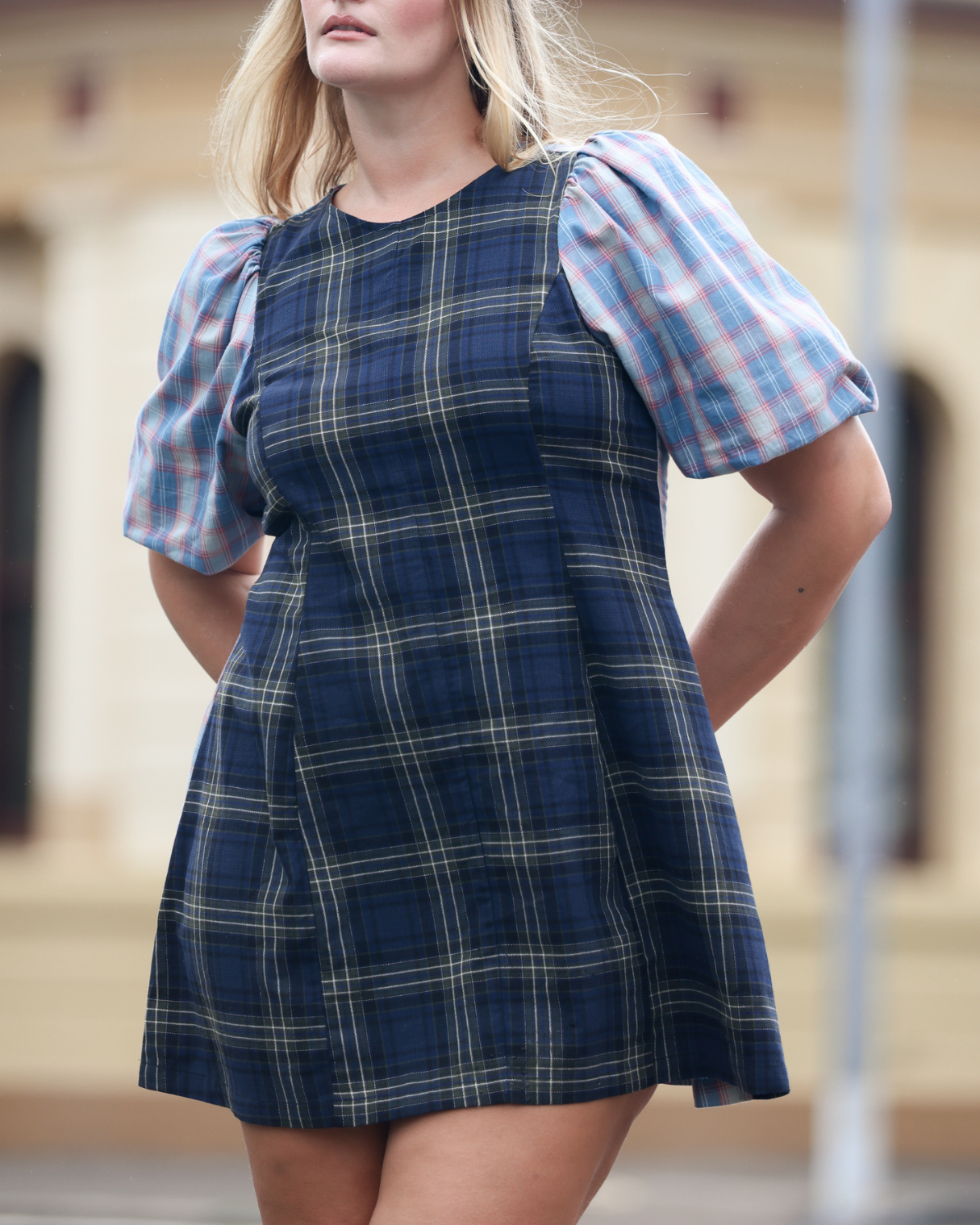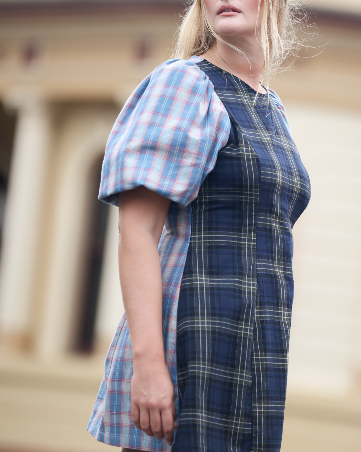 New & improved. We've developed the fabulous statement sleeves to have the perfect amount of volume. Paired with a figure-hugging body makes this iconic silhouette a crowd favourite once again. Made in our much loved, pastel blue & baby pink plaid fabric. Contrasted with a deep navy X green plaid - You're very welcome.