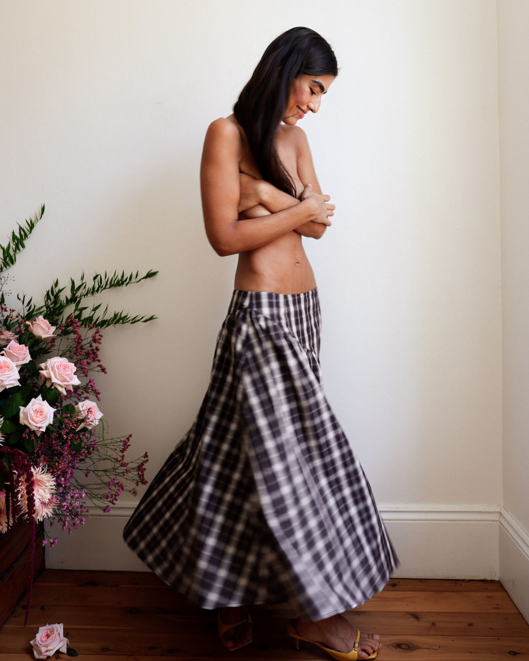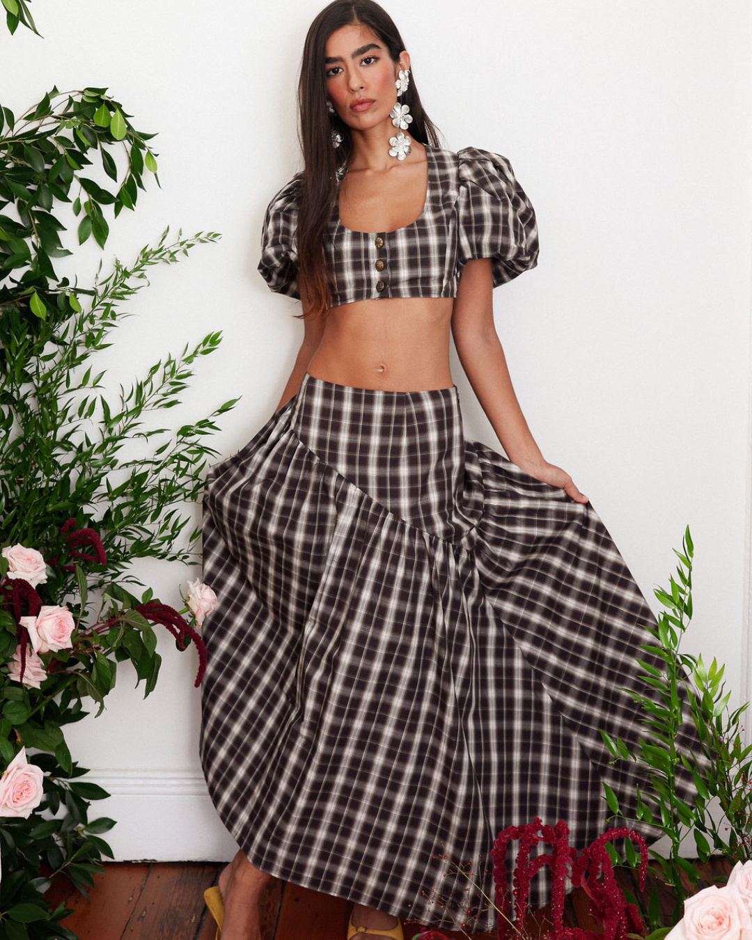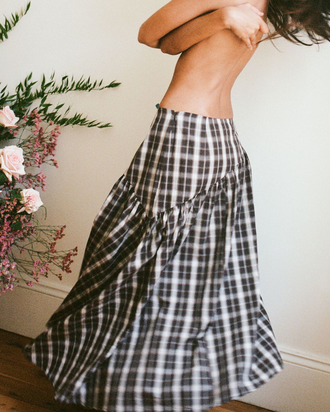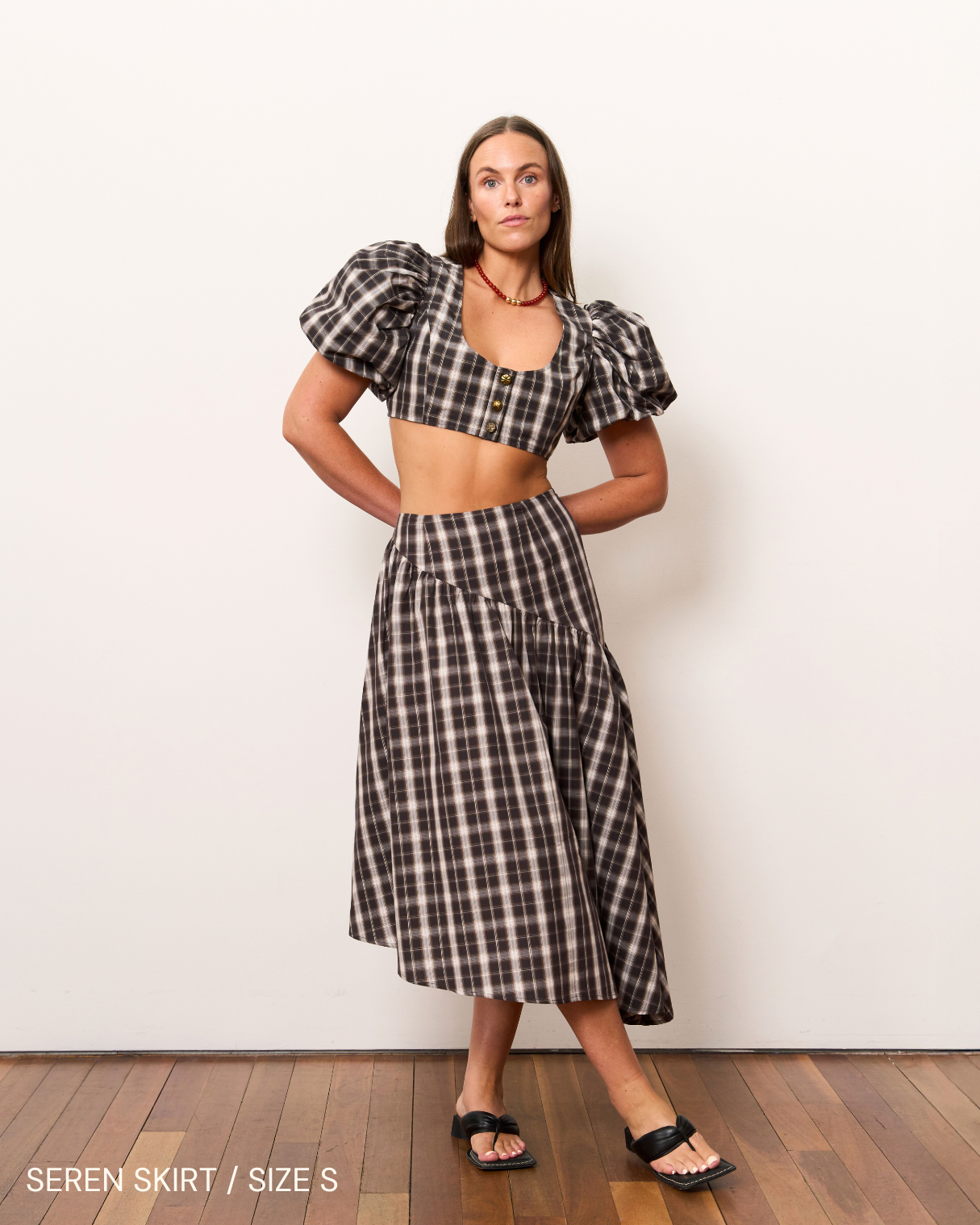 One of our longest standing styles, has been revamped in our 100% Cotton, Coffee Plaid print. Designed to be a staple, forever wardrobe piece. Featuring fitted paneling around the waist, followed by romantic asymmetrical gathering. Float through your day with stylish ease in The Seren – The Skirt for every occasion.