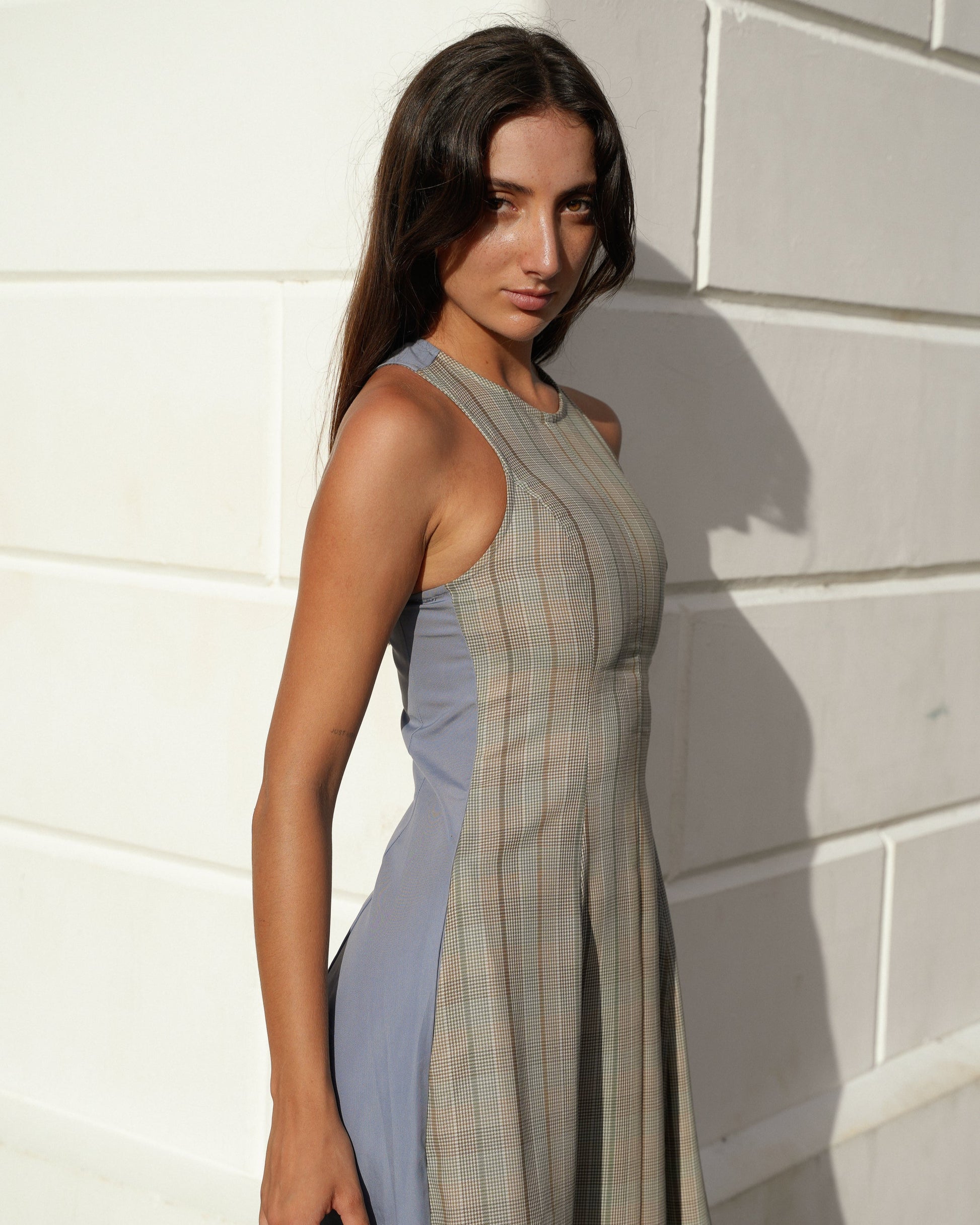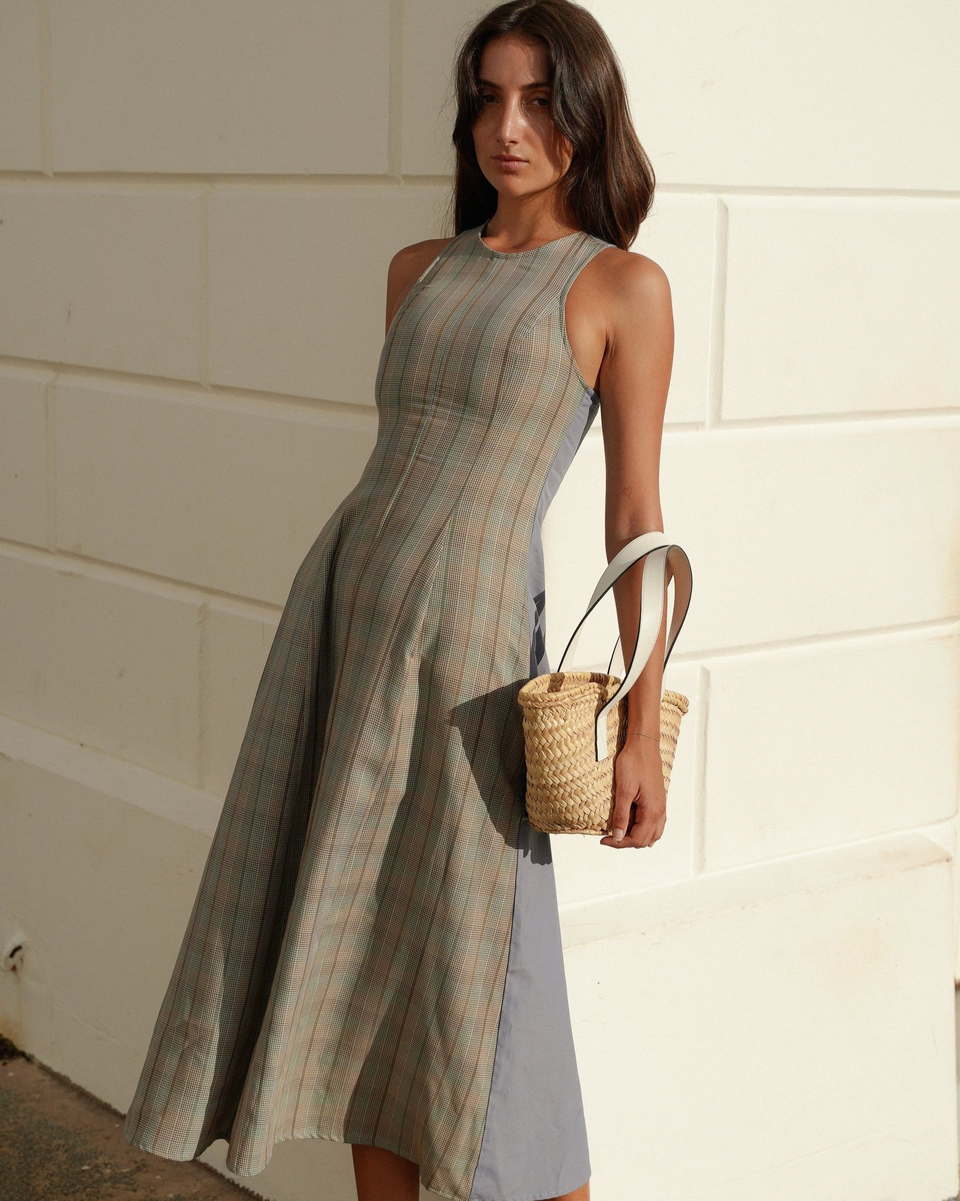 Expertly crafted to be ultra-flattering, its eight-panel design hugs you in all the right places so you feel super sexy. This version features a Green houndstooth on the front and contrasting sky-slate blue  at the back for a surprise pop of colour. The perfect excuse for an over-the-shoulder selfie!